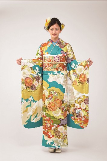 青藍地(あまいろ) 雲取りに菊文様 京友禅の振袖 雲取りに使っている金彩が豪華な振袖。雲の中の柄には宝尽くしや菊や流水など。あま色といわれる空の色のようなさわやかな色目が古典柄の振袖に映える。 モデル 加藤雛