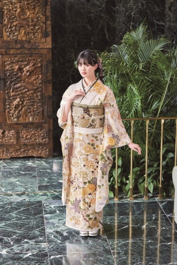 オフ白地に牡丹に梅と菊の京友禅振袖です。トラディショナルな柄行きを色目を抑えたイマドキの雰囲気に。 モデル 鶴嶋乃愛