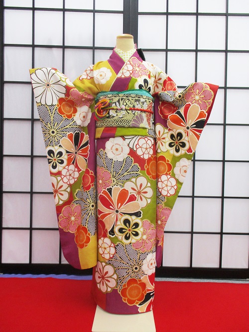 大きなお花柄が目を引く人気のお振袖!色目はシックなのに全体を見るとパッと明るい印象の豪華なお振袖です。