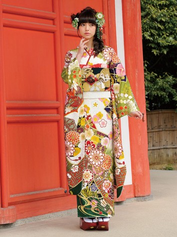 山本彩さんプロデュース振袖。 黄色地に緑や青の配色が個性的な...