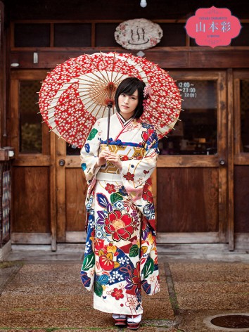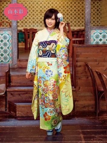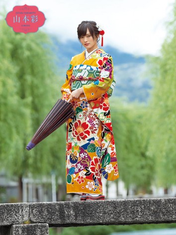 黄色地に可愛らしいデザインの山本彩さんプロデュースの振袖です。