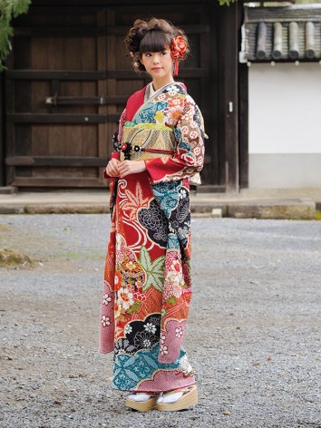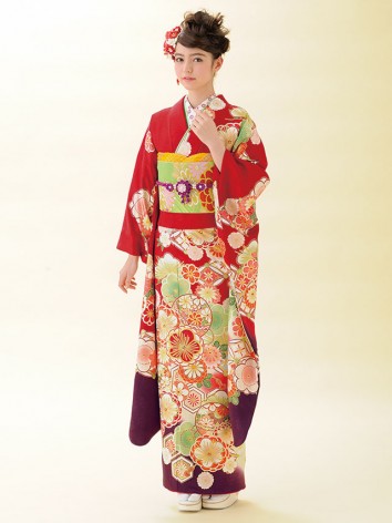華やかな赤地に映える大振りのねじり菊、ポイントの桜の模様は細...